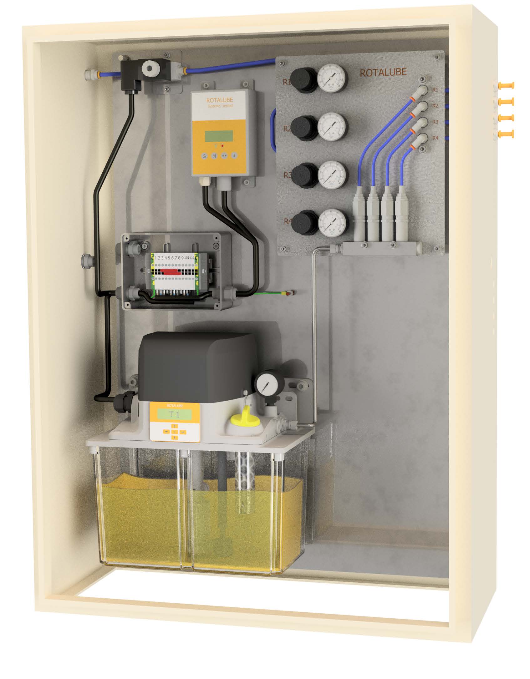 So können über eine zentrale Schmiereinheit (s. Bild) mehrere RotaLube Applikatoren mit Schmierstoff versorgt werden. Die Schmierintervalle können hierbei individuell nach den Anforderungen der Anwendung eingestellt werden. Die Schmierkettenräder werden ebenso entsprechend der vorliegenden Anforderungen gefertigt. Unser technischer Außendienst begutachtet hier gerne Ihre Anlagen und hilft bei der Bedarfsermittlung.